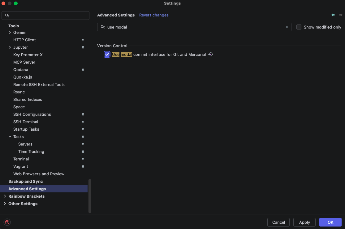 2.Enable the option Settings (⌘ + , or Ctrl + Alt + S) > Advanced Settings > Version Control > Use modal commit interface for Git and Mercurial